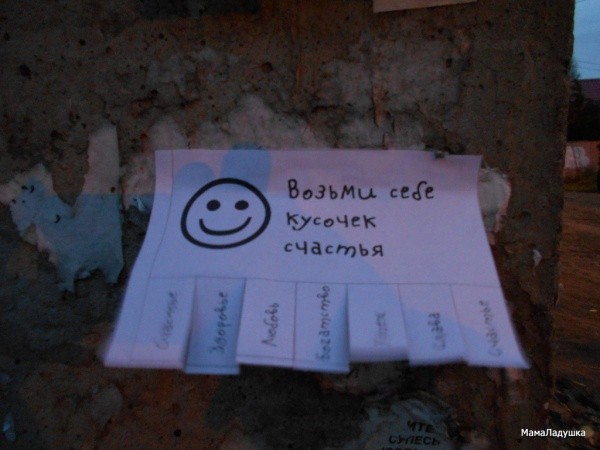 Прекрасная идея дарить «кусочки счастья» сразу многим людям! Я вот тоже не смогла удержаться от улыбки, глядя на ваши «объявления»