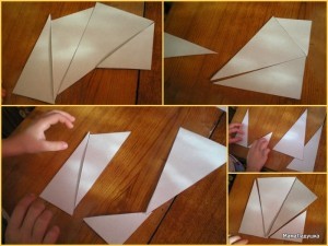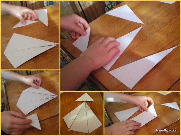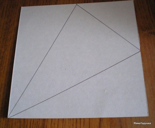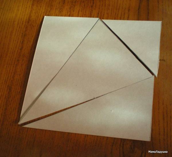 Для этого чертим линии, как на рисунке. Затем разрезаем квадрат на четыре треугольника.