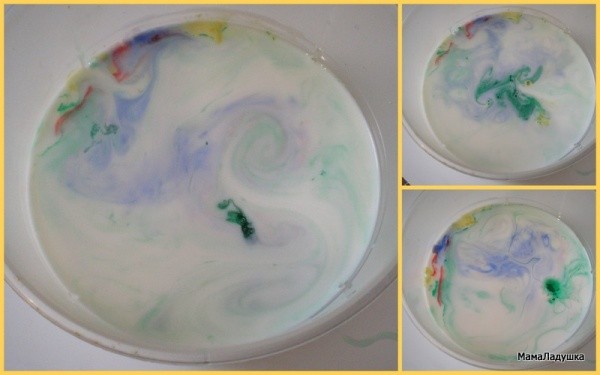 И… наблюдаем за появлением удивительных узоров, появляющихся на молоке.