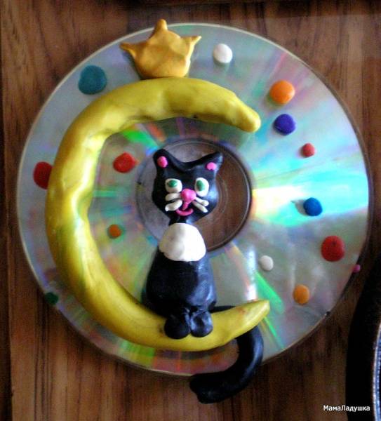 Для изготовления этой кошки пригодился старый диск и пластилин.
